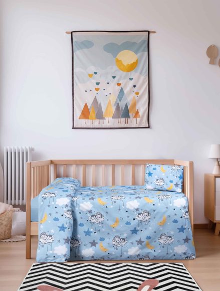 Διάσταση: Σετ σεντόνια κούνιας με λάστιχο: 120 x 170 + 70×140 + 15 + 1 μαξιλαροθήκη 30 x 40 εκ., Σετ σεντόνια κούνιας: 120 x 170 + 1 μαξιλαροθήκη 30 x 40 εκ., Σετ σεντόνια λύκνου: 70 x 120 εκ.