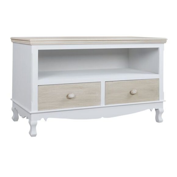 Μοντέρνο έπιπλο τηλεόρασης, σε χρώμα λευκό και γκρι. Εχει 2 συρτάρια και ένα ράφι για να τοποθετούνται ηλεκτρονικές συσκευές ή διακοσμητικά.