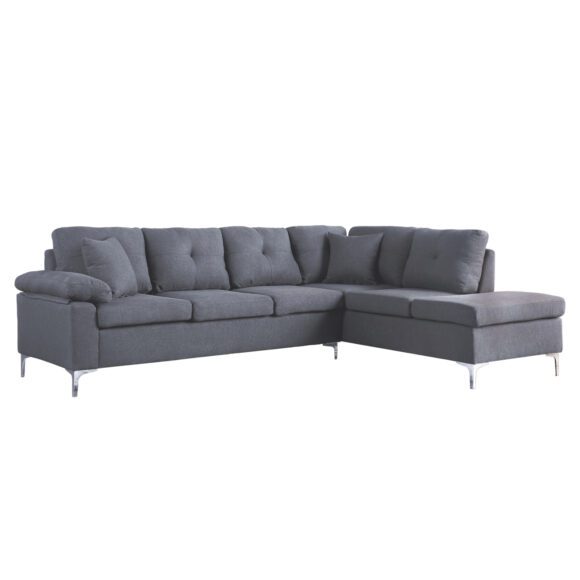 Καναπές-γωνία δεξιά, με επένδυση από γκρι ύφασμα σε μοντέρνο σχεδιασμό. Μια πολύ μοντέρνα ιδέα για κάθε σπίτι.