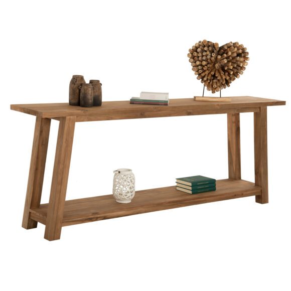 HM9554—Κονσόλα από ξύλο ΤΕΑΚ σε κανονικό μακρόστενο ορθογώνιο σχήμα επιφάνειας. Στηρίζεται σε 4 πόδια και διαθέτει άλλη μια παρόμοια επιφάνεια στο κάτω μέρος. Το ΦΥΣΙΚΟ χρώμα όλου του επίπλου προσδίδει μια ακαταμάχητη εικόνα που θα αποτελέσει το σημείο αναφοράς οπουδήποτε κι αν τοποθετηθεί η κονσόλα! Αποτελεί την επιτομή της ρουστίκ διακόσμησης σε λιτή κι απέριττη υλοποίηση, για τον χώρο που επιθυμείτε. Τι είναι όμως η κονσόλα; Η κονσόλα είναι ένα κομψό, γραφικό, συμπαγές έπιπλο που μπορεί να τοποθετηθεί σε σχεδόν οποιοδήποτε δωμάτιο- κουζίνα, διάδρομο, κρεβατοκάμαρα, παιδικό δωμάτιο, σαλόνι, dressing room, γραφείο, ακόμα και στο μπάνιο. Με αυτό, ο σχεδιασμός του χώρου γίνεται εκλεπτυσμένος, κομψός, πλήρως σκεπτόμενος. Η κονσόλα στο εσωτερικό χρησιμοποιείται τόσο ως μέρος ενός σετ με πολλά στοιχεία, όσο και ανεξάρτητα και επιλέγεται για τον γενικό σχεδιασμό του δωματίου.