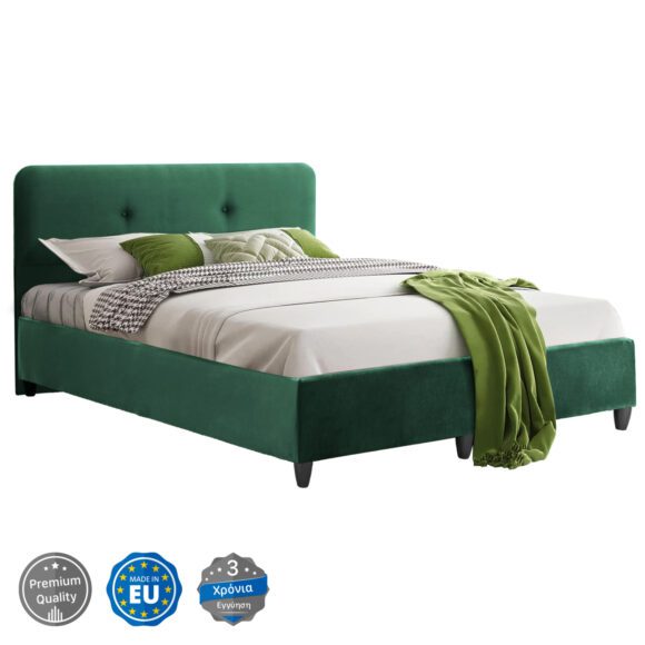 Το κεφαλάρι είναι ψηλό και έχει διακόσμηση με 2 μόνο τρουκς (κουμπάκια), ενώ και όλη η επένδυση του κρεβατιού είναι από υπέροχο βελούδινο ύφασμα. Το ΚΥΠΑΡΙΣΣΙ χρώμα σε όλο το κρεβάτι είναι ουδέτερο και μπορεί να συνδυαστεί με πληθώρα διακοσμητικών μοτίβων. Όμως, το κύριο χαρακτηριστικό αυτού του κρεβατιού είναι ότι δεν ακολουθεί την κλασική κατασκευή με τις τάβλες του σομιέ για την στήριξη του στρώματος, αλλά αντίθετα αποτελείται από μια συνεχόμενη επιφάνεια (2 μοριοσανίδες) πάνω στην οποία τοποθετείται το στρώμα! Σε διαστάσεις στρώματος 150×200 εκ. θα χωρέσει κάθε σας όνειρο!