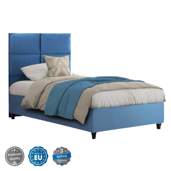 Το κρεβάτι MILO έχει ψηλό κεφαλάρι, επενδυμένο με καπιτονέ τεχνοτροπία σε μεγάλα ορθογώνια, ενώ και όλη η επένδυση του κρεβατιού είναι από βελούδινο ύφασμα. Το ΜΠΛΕ χρώμα σε όλο το κρεβάτι είναι εντυπωσιακό και μπορεί να συνδυαστεί με πληθώρα διακοσμητικών μοτίβων. Όμως, το κύριο χαρακτηριστικό αυτού του κρεβατιού είναι ότι δεν ακολουθεί την κλασική κατασκευή με τις τάβλες του σομιέ για την στήριξη του στρώματος, αλλά αντίθετα αποτελείται από μια συνεχόμενη επιφάνεια (μοριοσανίδα) πάνω στην οποία τοποθετείται το στρώμα! Σε διαστάσεις μονού στρώματος 90×200 εκ.