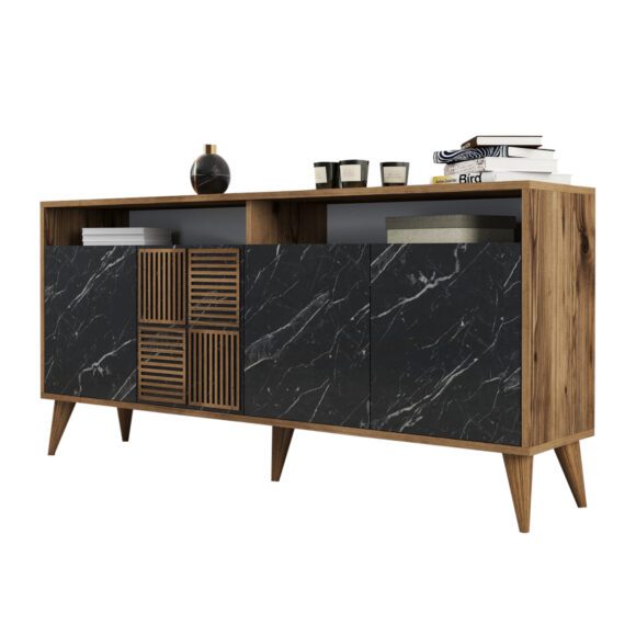 Ο μπουφές ΗΜ9506.02 είναι ένα επιβλητικό έπιπλο όπου κι αν τον τοποθετήσετε. Έχει ψηλά και πλαγιαστά πόδια σε καρυδί απόχρωση και δύο μεγάλα ντουλάπια με ράφι, που ανοίγουν με διπλές πόρτες. Ακριβώς επάνω από τα ντουλάπια και κάτω από την επάνω επιφάνεια υπάρχει ανοιχτός χώρος αποθήκευσης. Το μήκος του εξασφαλίζει ότι η επιφάνεια του είναι μεγάλη και αρκετή για τοποθέτηση πολλών αντικειμένων. Το χρώμα όλης της κατασκευής είναι καρυδί, ενώ όλες οι πόρτες έχουν εφέ ΜΑΥΡΟΥ μαρμάρου. Η μία πόρτα, μάλιστα, φέρει και καρυδί λεπτομέρειες. Ο μπουφές αυτός θα σας ενθουσιάσει! Τι είναι όμως ο μπουφές; Ο μπουφές είναι ένα άκρως πρακτικό έπιπλο, αφού στους αποθηκευτικούς του χώρους μπορούμε να βάλουμε από σερβίτσια πιάτων και ποτήρια, μέχρι κεριά και διάφορα άλλα χρηστικά αντικείμενα που έχουμε στο σπίτι μας, ώστε να είναι τακτοποιημένα και να μη δημιουργούν ακαταστασία στο χώρο.