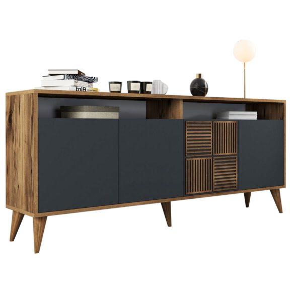 Ο μπουφές ΗΜ9431.01 είναι ένα επιβλητικό έπιπλο όπου κι αν τον τοποθετήσετε. Έχει ψηλά και πλαγιαστά πόδια σε καρυδί απόχρωση και δύο μεγάλα ντουλάπια με ράφι, που ανοίγουν με διπλές πόρτες. Ακριβώς επάνω από τα ντουλάπια και κάτω από την επάνω επιφάνεια υπάρχει ανοιχτός χώρος αποθήκευσης. Το μήκος του εξασφαλίζει ότι η επιφάνεια του είναι μεγάλη και αρκετή για τοποθέτηση πολλών αντικειμένων. Το χρώμα όλης της κατασκευής είναι καρυδί, ενώ όλες οι πόρτες είναι σε ανθρακί απόχρωση. Η μία πόρτα, μάλιστα, φέρει και καρυδί λεπτομέρειες. Ο μπουφές αυτός θα σας ενθουσιάσει! Τι είναι όμως ο μπουφές; Ο μπουφές είναι ένα άκρως πρακτικό έπιπλο, αφού στους αποθηκευτικούς του χώρους μπορούμε να βάλουμε από σερβίτσια πιάτων και ποτήρια, μέχρι κεριά και διάφορα άλλα χρηστικά αντικείμενα που έχουμε στο σπίτι μας, ώστε να είναι τακτοποιημένα και να μη δημιουργούν ακαταστασία στο χώρο.