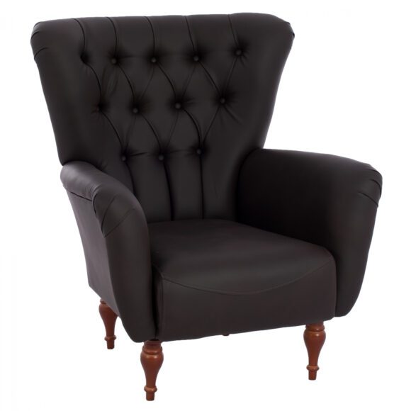 Αυτή είναι η μπερζέρα ΗΜ9217.03 σε ΚΑΦΕ χρώμα και πόδια πολυπροπυλενίου σε καρυδί χρώμα. Το χαρακτηριστικό που κάνει αυτή την πολυθρόνα να ξεχωρίζει είναι ότι η τεχνοτροπία της είναι σε στυλ Chesterfield, πράγμα που δίνει την αίσθηση κύρους και πολυτέλειας οπουδήποτε κι αν χρησιμοποιηθεί. Το κύριο χαρακτηριστικό αυτού του στυλ, είναι η επένδυση με PU leather, το οποίο στην πλάτη είναι σε βαθιά καπιτονέ τεχνοτροπία, υπηρετώντας το στυλ Chesterfield.