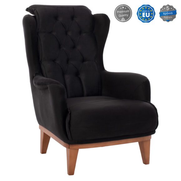 Σας παρουσιάζουμε την μπερζέρα BENNINGTON, σε ΜΑΥΡΟ χρώμα με ξύλινα πόδια σε φυσική απόχρωση. Η επένδυση της πλάτης έχει γίνει με τεχνοτροπία καπιτονέ που προσδίδει ιδιαίτερη ομορφιά στην μπερζέρα σε συνδυασμό, φυσικά, με την βελούδινη επένδυση.