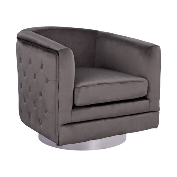 Βελούδινη πολυθρόνα, σε γκρι απόχρωση με διακοσμητικά κουμπιά και ασημί γυαλιστερή βάση.