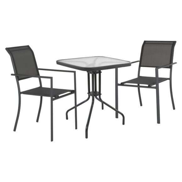ΗΜ11808—Σετ εξωτερικού χώρου με τραπέζι με ΓΚΡΙ μεταλλικό σκελετό και γυάλινη θολή ΕΝΙΣΧΥΜΕΝΗ επιφάνεια και 2 πολυθρόνες αλουμινίου με textilene σε ΓΚΡΙ χρώμα.