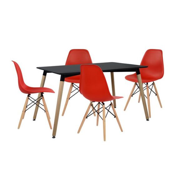 Τέσσερις Καρέκλες με ξύλινα πόδια και πολυπροπυλένιο σε κόκκινη απόχρωση. Τα πόδια της καρέκλας είναι απο μασίφ ξύλο.