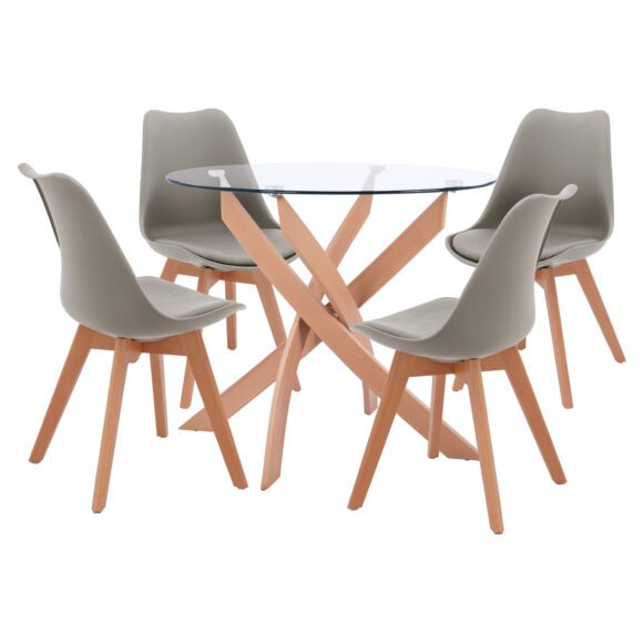 Τέσσερεις μοντέρνες καρέκλες σε έναν άψογο συνδυασμό ξύλου-πολυπροπυλενίου-τεχνοδέρματος σε γκρι και φυσική απόχρωση. Μια πρόταση που θα αναδείξει κάθε γωνία του σπιτιού σας.