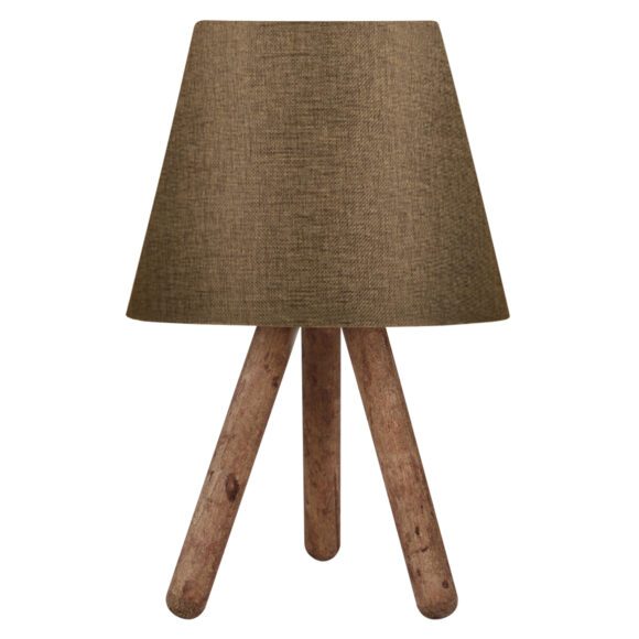 Ένα πολύ ιδιαίτερο και μοντέρνο επιτραπέζιο φωτιστικό. Δεν έχει την κλασική βάση ενός επιτραπέζιου φωτιστικού αλλά στέκεται σε ένα ξύλινο τρίποδο με το καπέλο του να στηρίζεται στην κορυφή του τρίποδου. Η σχεδίαση παραπέμπει περισσότερο σε επιδαπέδιο φωτιστικό παρά σε ένα επιτραπέζιο. Τα πόδια έχουν το μέγεθος και την μορφή σκυτάλης σε καφέ χρωματισμό, ενώ το καπέλο του φωτιστικού είναι επίσης καφέ και έχει κυκλικό και τραπεζοειδές σχήμα. Αυτού του είδους τα φωτιστικά δεν προορίζονται για φωτιστικά διαβάσματος και αυτό πρέπει πάντα να λαμβάνεται υπόψη κατά την επιλογή τους. Είναι καθαρά διακοσμητικά και το ταίριασμά τους με τον περιβάλλοντα χώρο θα πρέπει να είναι αρμονικό. Αυτό το φωτιστικό είναι μοντέρνο, κομψό και βολικό σε διαστάσεις παρέχοντας αμέτρητες δυνατότητες «δεσίματος» με την υπόλοιπη διακόσμησή σας. Είναι ένα μικρό έργο τέχνης.