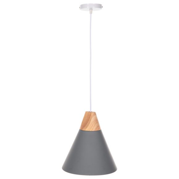 Ανακαλύψτε αυτό το νέο μας κρεμαστό φωτιστικό οροφής και ολοκληρώστε την διακόσμησή σας. Πρόκειται για ένα φωτιστικό με ΓΚΡΙ μεταλλικό καπέλο σε σχήμα καμπάνας με λεπτομέρεια ξύλου στην κορυφή του φωτιστικού. Αισθητικά, ολοκληρώνεται με το λευκό καλώδιο κρέμασης και την λευκή βάση οροφής, και αποτελεί την τελευταία τάση στα φωτιστικά οροφής.