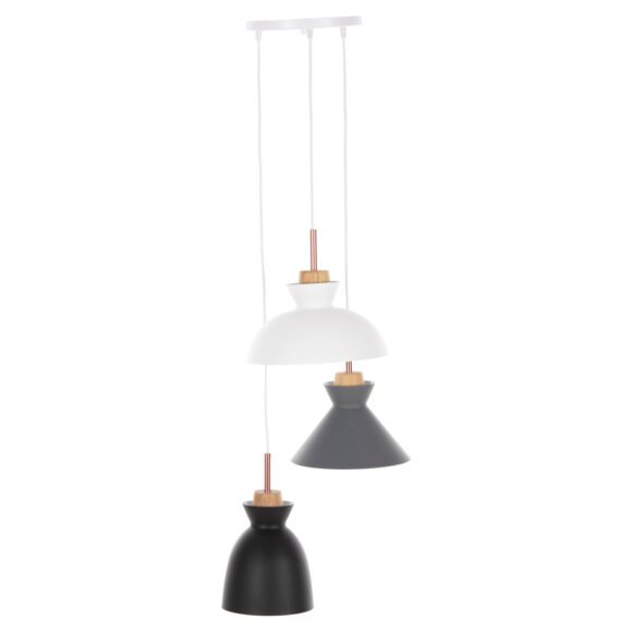 Ανακαλύψτε το όμορφο 3-φωτο φωτιστικό οροφής HM4142. Ένα φωτιστικό που θα συμπληρώσει την διακόσμηση του σαλονιού, χάρη στα 3 καπέλα με διαφορετικό σχήμα και διαφορετικό χρώμα η κάθε μια. Τα 3 χρώματα (γκρι-λευκό-μαύρο) συνοδεύονται με την λεπτομέρεια από ξύλο, από το οποίο κρέμονται τα καπέλα και φτάνει μέχρι το ντουί βιδώματος της λάμπας.