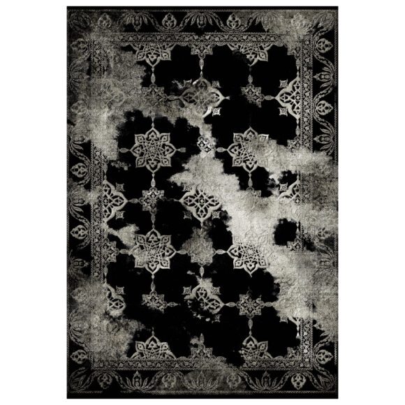 Αυτό το χαλί έχει κυρίαρχο χρώμα φόντου το ΜΑΥΡΟ, με ευδιάκριτη λουλουδάτη μπορντούρα αλλά και ευδιάκριτα σχέδια στο κέντρο παρά το γεγονός ότι το γενικότερο στυλ του χαλιού παραπέμπει σε ξεβαμμένη τοιχογραφία και σίγουρα θα αποτελέσει αντικείμενο συζητήσεων στο σαλόνι σας. Άλλωστε, η γοητεία πού ασκεί το χαλί είναι τόσο δυνατή, πού κανένα δεν αφήνει αδιάφορο. Δίνει μοντέρνα όψη χωρίς υπερβολές, «παντρεύοντας» ένα κλασικό σχέδιο με το «ξεβαμμένο» στυλ.