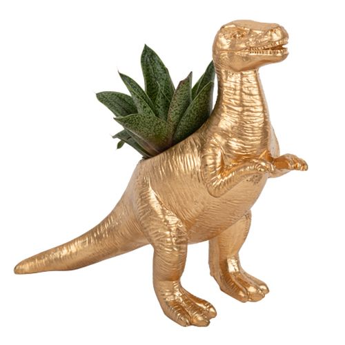 Προσθέστε μια τολμηρή πινελιά στη διακόσμησή σας με αυτό το εντυπωσιακό βάζο σε σχήμα Τυραννόσαυρου Ρεξ. Με χρυσό φινίρισμα και μοναδικό design, είναι ιδανικό για μικρά φυτά ή διακοσμητικά στοιχεία. Διαστάσεις: 16 x 18 x 6,5 cm.