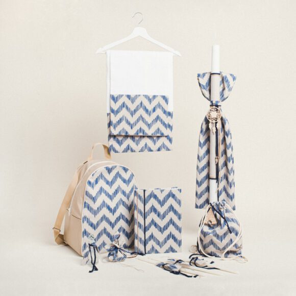 Ένα μοντέρνο και γεμάτο χαρακτήρα σετ βάπτισης με σχέδιο μπλε ζιγκζαγκ, ιδανικό για μια δυναμική και στιλάτη βάπτιση.