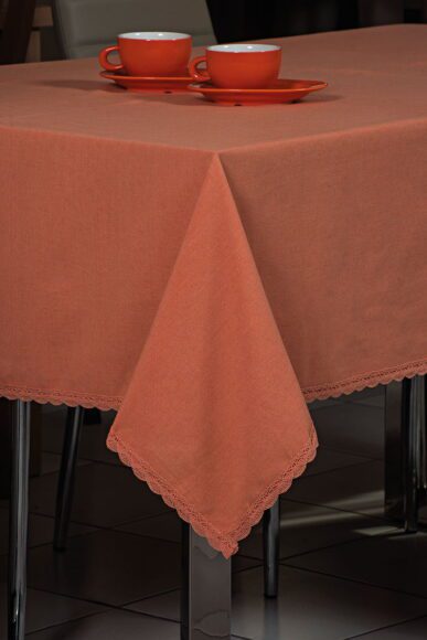 Μονόχρωμο τραπεζομάντηλο με δαντέλα περιμετρικά. Η ποιότητά του είναι 50% Βαμβάκι – 50% Λινό